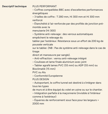 Solution pour la construction neuve, le coffre tunnel est équipé d'un tablier aluminium ou PVC qui s'intègre directement dans le bâti maçonné.